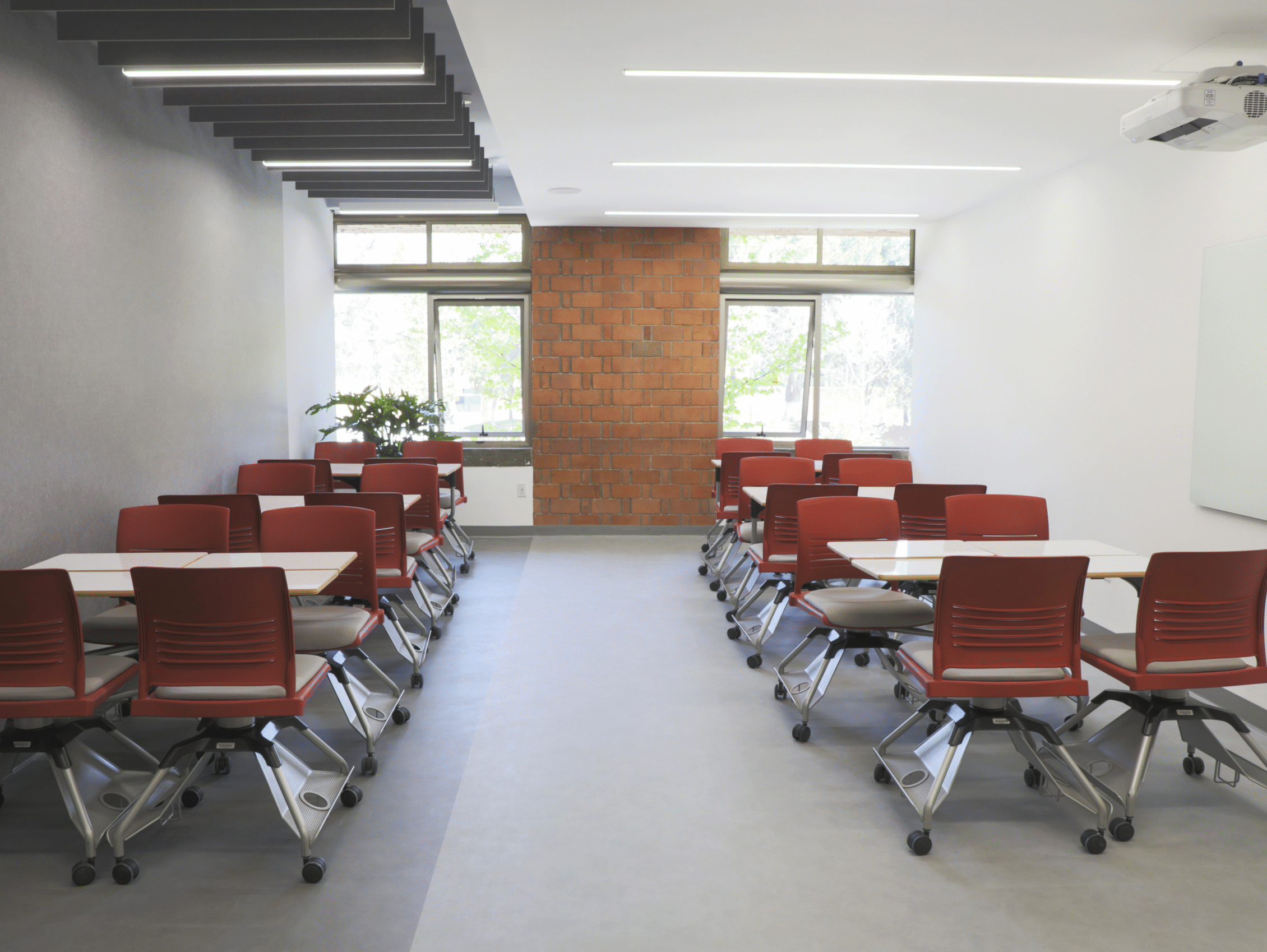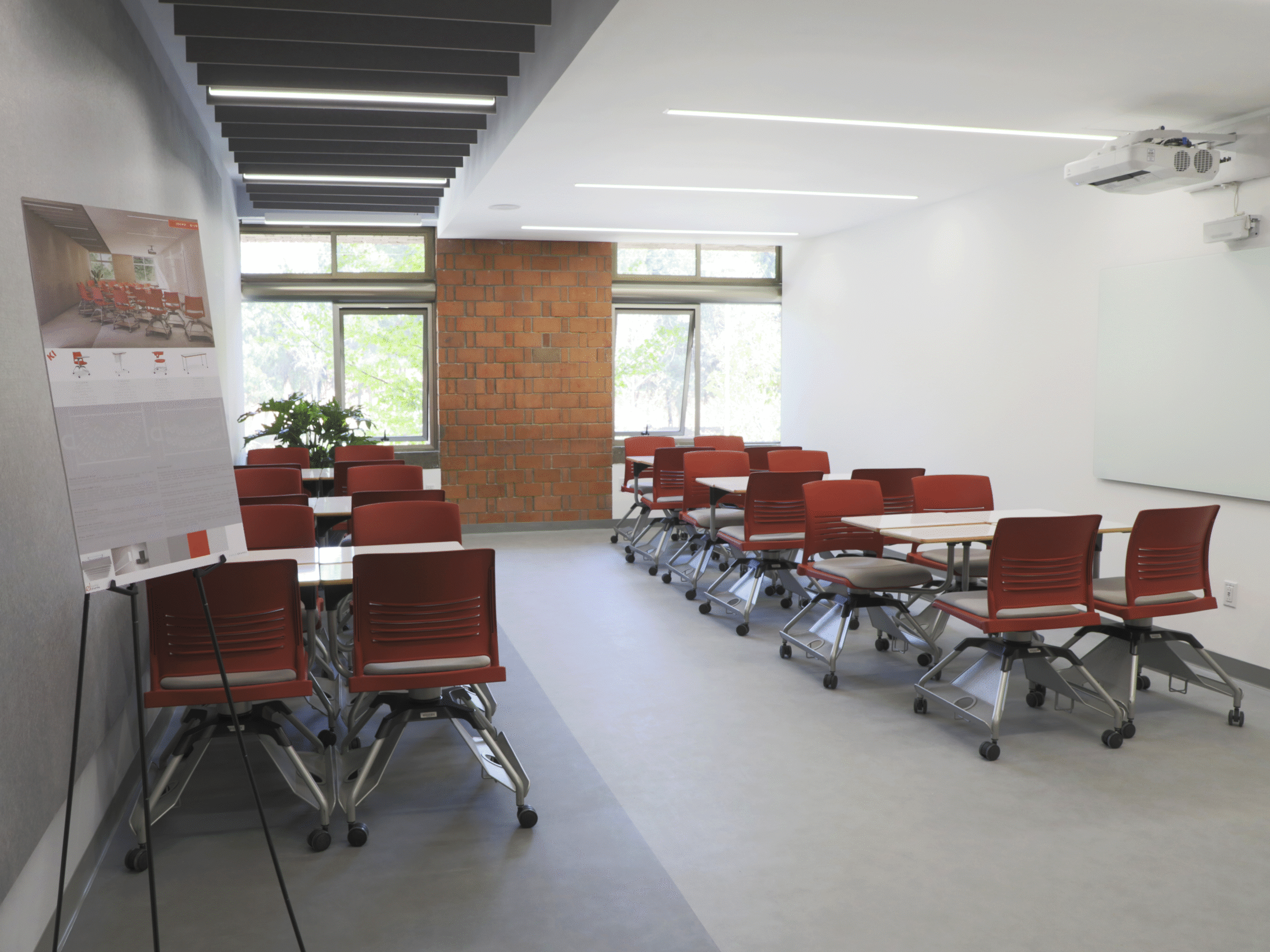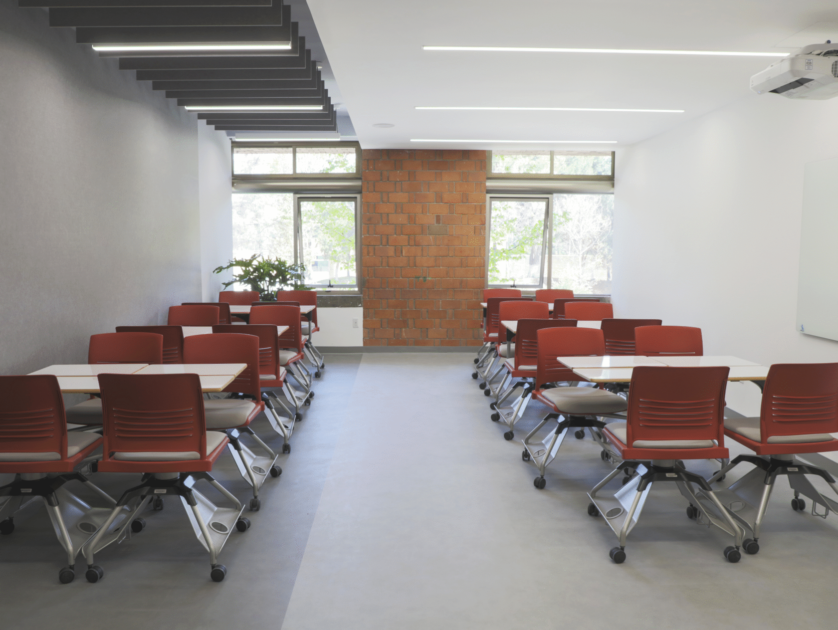 El objetivo fue crear un aula versátil que favoreciera la interacción y el aprendizaje colaborativo, utilizando mobiliario ergonómico, resistente y de fácil movilidad, acompañado de un piso de alto rendimiento que combina estética y durabilidad. El plafón acústico y las luminarias LED optimizan la iluminación y la acústica, mejorando la experiencia de estudiantes y docentes.